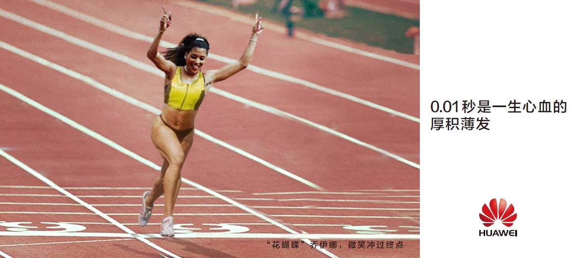 在一次比赛中,乔伊娜微笑冲过终点。她创造的女子100米短跑世界纪录至今无人打破。乔伊娜说:“对于短跑选手来说,跑完赛场上的100米总共只有10秒钟左右的时间。所以我们会把每一秒钟都划分成100个等份来计算,很多人为了提高这百分之一秒的成绩而甘愿付出巨大的努力。要知道,每0.01秒都是很重要的。”喻意:0.01秒是一生心血的厚积薄发,华为将为实现未来信息社会的突破而不懈努力。