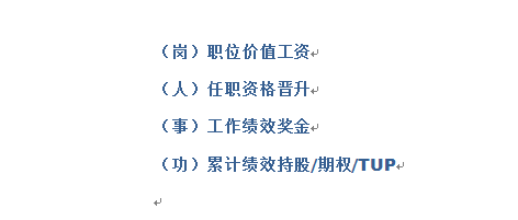职位对应工资;资格决定晋升;绩效决定价值。如果有的人在一个职位上能够长期保持高绩效,那么累计绩效就是持股,当然也可以通过期权的方式,但华为没有期权,因为她不是上市公司,华为实行的是员工持股计划。今年,华为在员工持股的基础上,又加了一个TUP计划,所以现在的华为是员工持股+TUP,这是一种新的激励方式,来解决评价和分配的结合。这样的报酬方式是基于评价的,而不是基于上下级关系,不是基于人格,也不是基于情怀的。