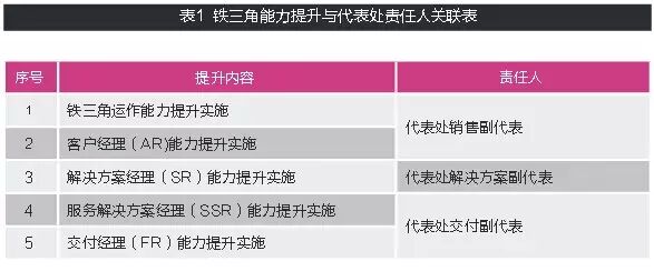 代表处代表是铁三角能力提升的第一责任人,特别在铁三角组织运作能力提升方面。铁三角组织整体运作能力和成员角色能力提升的具体责任人如表1所示。