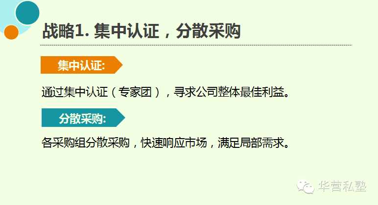 凭借组织架构、流程和IT系统,可以达到集中式的采购战略、数量杠杆运用、成本最优、供应商选择、供应商基本管理等目的。同时可以通过分散采购达到灵活决策、响应市场和满足局部需求的目标,这样的运作模式使采购变得高效、简洁。