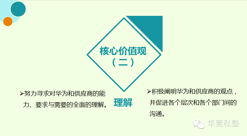 华为的核心理念之一就是,客户是华为存在的唯一价值。供应商要和华为一道,有对这一共同追求的价值的理解,要共同为最终客户提供更有价值的解决方案。