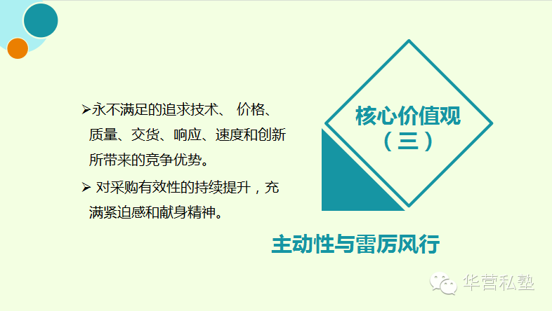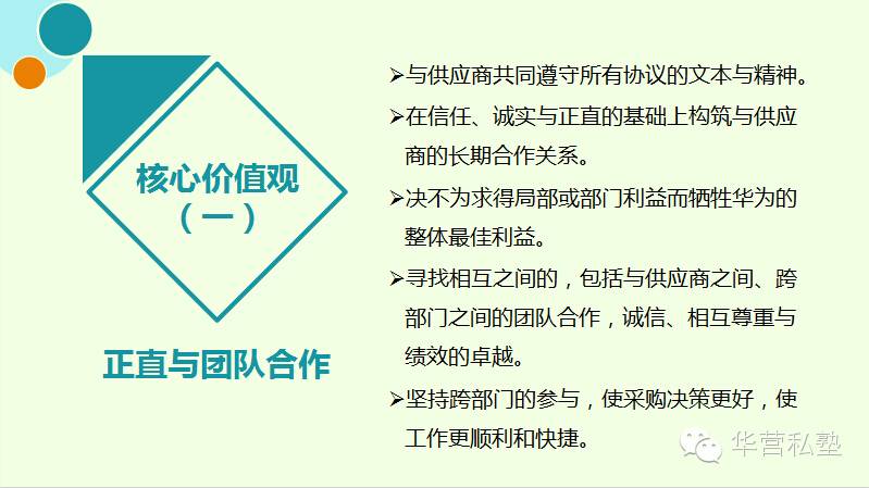 直到今天,华为在采购的执行过程当中仍然在不断地体会、不断地印证它的核心价值观,即正直与团队合作、理解、主动性与雷厉风行: