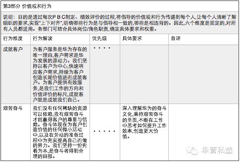 从心理学的角度上来说,我们想让受训者理解和接受一些内容的时候,要不停的对他进行刺激,然后反应—强化—刺激—强化……通过这种刺激和强化的过程最终会达到训练的目的。所以从这个角度上来说,我认为华为有些部门将核心价值观作为自评项目放入了员工的PBC当中,每三个月review一次,亦可达到类似的效果。