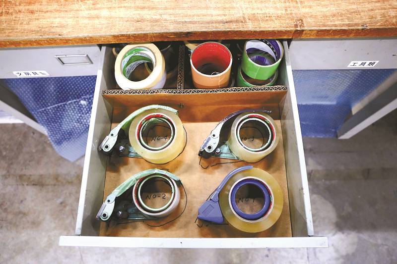打开仓库的工具箱,其“内部装修”也让人惊叹。库管人员使用废弃的包装盒,在抽屉内分隔出大小不同的空间,画着不同文具、工具的形状,让每种文具、工具在使用之后立即各自归位,既容易找,又不易丢,大大提升了工作效率。