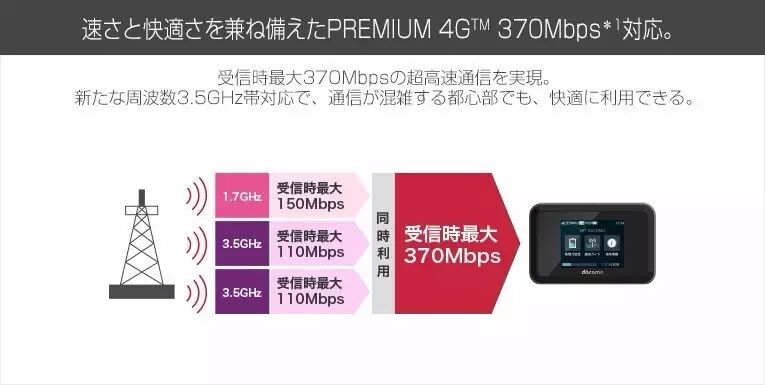 “日本最大的运营商NTT docomo宣布,使用搭载华为Balong750芯片的最快移动热点HW-01H,在3.5GHz新频段上为日本用户提供最高370Mbps的‘PREMIUM 4G’极速上网服务,刷新了日本移动上网速率的新纪录。”