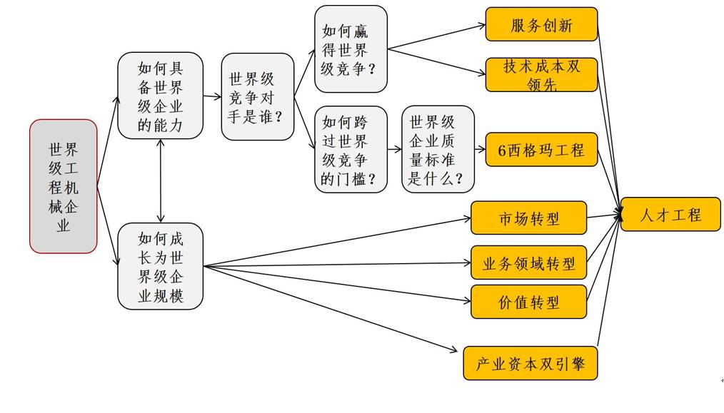 简单说,既然世界级,那么一定要实现世界级的体量和能力吧,如果要具备世界级的能力,以前的竞争对手可能是厦工、徐工,那么现在要对标小松和卡特彼勒,如果要对标小松和卡特彼勒,那么技术能力目标要求、质量标准要求是不是要改变?对员工的要求是不是要改变?该采取哪些措施是不是明晰?下图就是围绕“世界级”信念的思考。